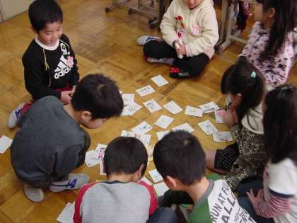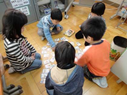 生活科で,昔遊びをしました。子どもたちが発表したいろいろな遊びの中から,今回は,かるたと百人一首(坊主めくり)をしました。百人一首の説明をした後,坊主めくりをしました。はじめて経験する子もいて,何が出るかわくわくした様子で楽しそうに遊んでいました。次は,自分たちで遊び道具を作って遊ぶ予定です。どんな遊び道具ができるか楽しみです。
