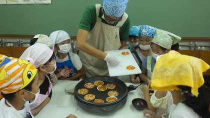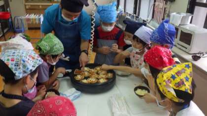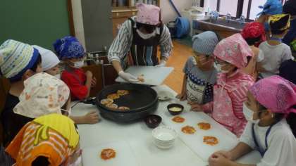 昨日作ったトマトソースを使って,2時間目に2年1組がトマトピザの調理実習をしました。自分で具材をのせて,ホットプレートで焼いています。