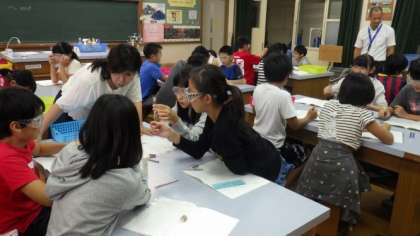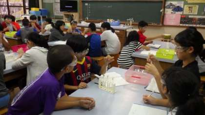 理科室で学習しています。いろいろな水溶液を観察しています。