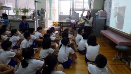 今日は4年生が発育測定をしています。目のしくみや,目を大切にすることについての話を聞きました。