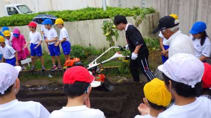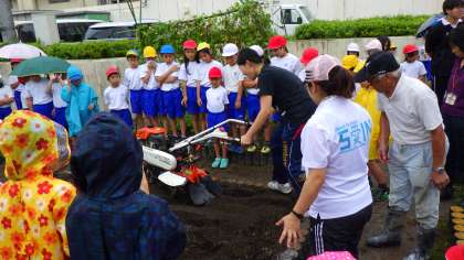 子どもたちは,雨が降ってきても積極的に苗を植えたいと頑張ってくれました。教員も,耕運機を動かしたり,くわで耕したりして頑張りました。