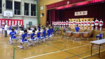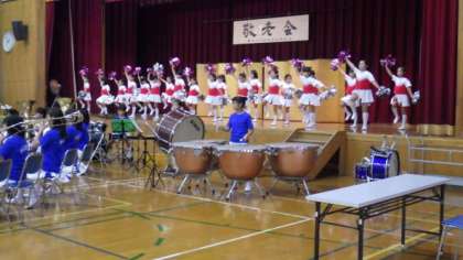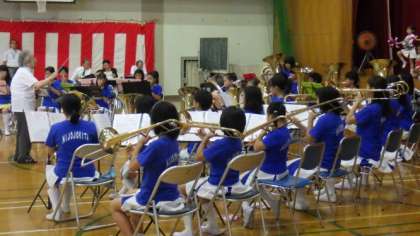 地域の敬老会で,金管マーチングバンド・ガード隊が発表しました。運動会の入場行進で披露する曲などを演奏しました。