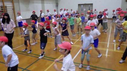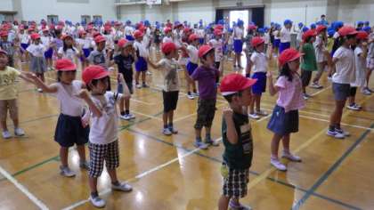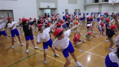 今日の「運動会フリータイム」は,赤組と青組が体育館で全校体操の練習,白組と黄組が運動場で応援練習をしました。