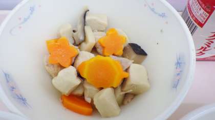 高野豆腐と野菜の炊き合わせは,高野豆腐をけずりぶしでとっただし汁と砂糖と醤油で煮含めてから,鶏肉・人参・しいたけ・筍などと煮つけました。人参が木の葉や花の形になっていて,秋らしいほっこりとした料理になりました。