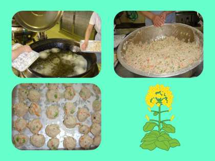 『がんもどきのあんかけ』・・・水を切った豆腐にとりひき肉・おから・しいたけ・えだ豆をまぜあわせてから,丸めて,油で揚げました。ふんわりとしたがんもどきにだしのきいたあんがよくあいます。がんもどきは,ひとつずつ心をこめて作りました。