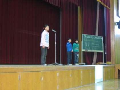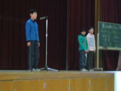 今日は,朝会で校長先生のお話を聞いた後,14回目のにじょっこタイムがありました。4年2組のお友だちが,国語や総合的学習の時間で学習した「伝え合う心」について体験したことや考えたことを作文にして発表しました。
