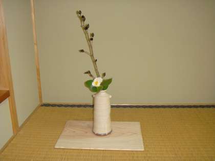 今日のお花は,「伊賀風樹(いがふうじゅ)と白玉椿(しらたまつばき)」です。