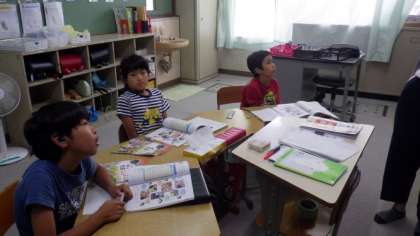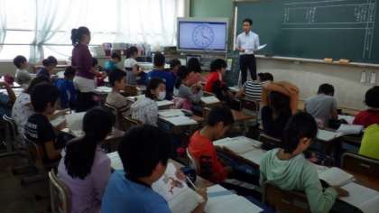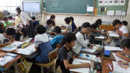 5年1組は算数の学習で,面積の求め方についてグループで話し合っています。5年2組は国語で,物語文「大造じいさんとがん」の学習をしています。3年草の芽学級は社会の学習で,スーパーマーケットの見学に向けて,スーパーマーケットで働く方に質問したいことを考えています。