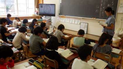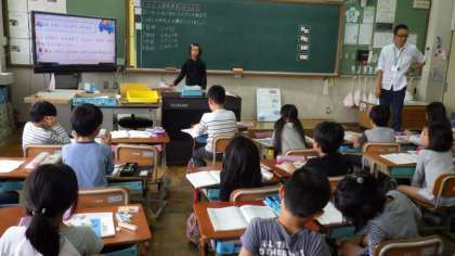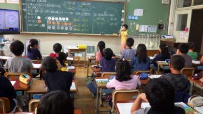 2年生は算数で,九九の学習をしています。4年1組は国語の学習で,物語文「ごんぎつね」の朗読CDを聞いて感想を書いています。4年3組は算数の学習で,2けたのわり算の筆算について,自分の考えを発表しています。