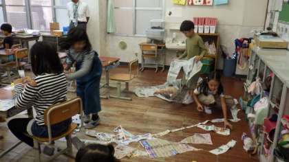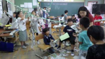 使わなくなった新聞紙やチラシを使って造形遊びをしています。思い思いにちぎったり切ったりした紙を,つなげたりつるしたりして楽しんでいます。
