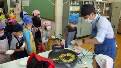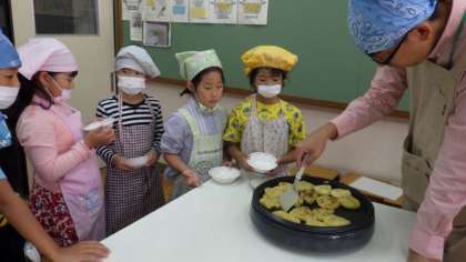 今日は1・2時間目に2年1組がいももちづくりをしました。自分たちで育てたサツマイモを使って調理したいももちを食べるのが,待ち遠しいようです。