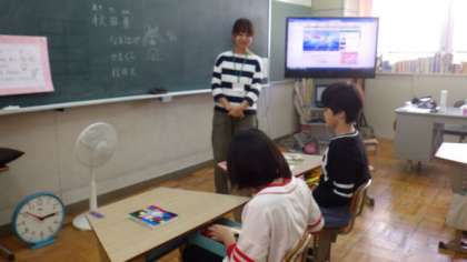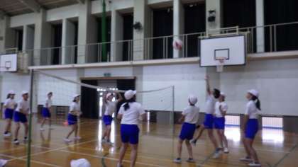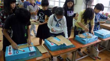 3年生は図画工作で,段ボールと割ピンを使って造形遊びをしています。わかたけ学級は,映像教材を使って都道府県の学習をしています。6年生は体育で,ソフトバレーボールをしています。