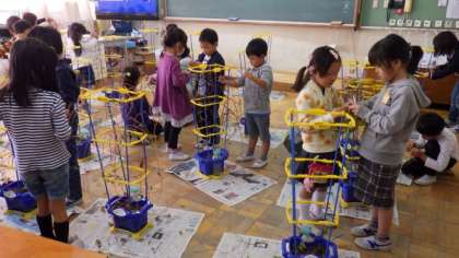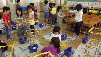 大切に育ててきたアサガオのつるを使って,リース作りをしました。友達と協力して,支柱からアサガオのつるを外しています。