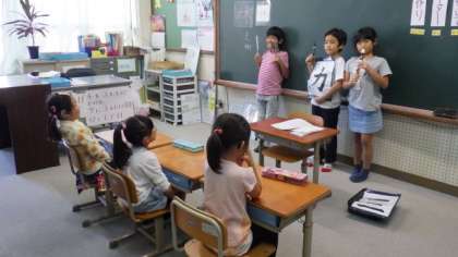 3年生は,発表の準備を待つ間も,1年生が楽しく過ごせるようにじゃんけん大会をしたり,発表の途中に優しく声をかけたりと,上級生としてのすてきな姿をたくさん見せていました。1年生も,学校のいろいろな話を聞いて,とても楽しかったようです。