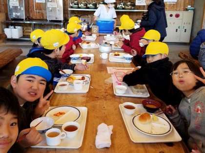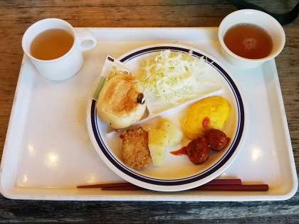 朝食では,はじめて食堂での食事をいただきました。汁物は,みそ汁かスープを選びました。ご飯かパンを選び,おかずもバイキングカウンターで自分で選びました。