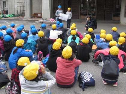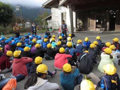 朝の小雨があがり,冒険の森アスレチックを行うことができました。レク係が冒険の森での注意事項を説明しています。