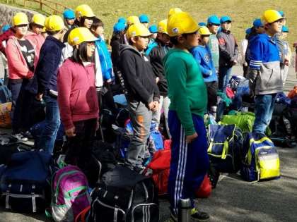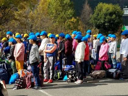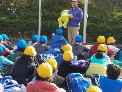 退所式を行いました。花背山の家マスコットキャラクター「ハナコロ」ちゃんにも見送ってもらいました。