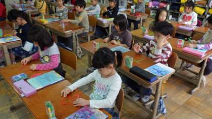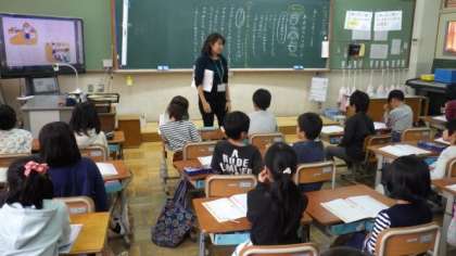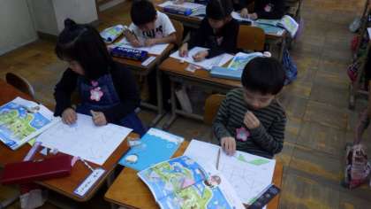 1年生は算数で,色板や数え棒を使って「かたちづくり」の学習をしています。2年生は道徳で,「ある日のくつばこで」というお話を読んで考えたことを発表しています。