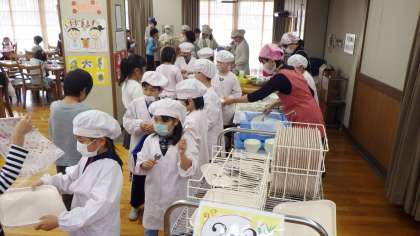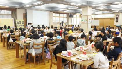 今週は,2−2と4−1が「なかよし給食」を行います。ランチルームで自己紹介をしながら給食を味わって食べていました。