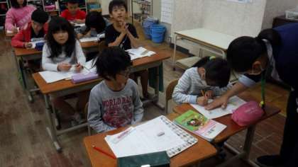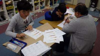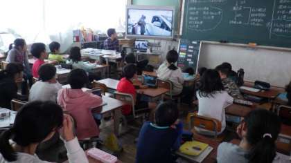 わかたけ学級は算数で,ワークシートを使って学習しています。5年生は社会で,自動車作りについて映像教材をみて学習しています。3年生は算数で,かけ算の筆算の学習をしています。