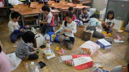 身の回りの箱やペットボトルなどを使って,どんなものがあるか,どんなことができそうか,考えています。