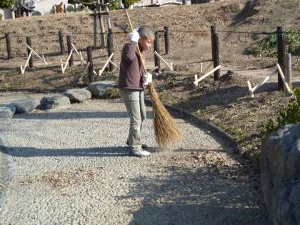 竹ぼうきや熊手を使い枯葉や落ち葉を集めたり,空き缶やたばこのすいがらなどたくさんのゴミも集めました。
