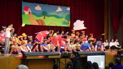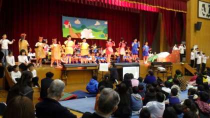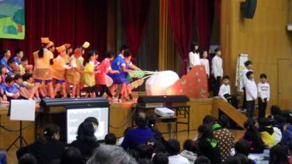 外国語活動で学習した英語の表現を使って,1年生の国語で学習する物語文「おおきなかぶ」の英語劇を発表しました。