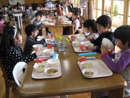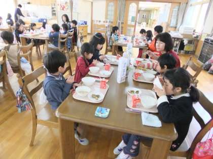 25日に,待賢幼稚園の友達とランチルームで一緒に給食を食べました。手の洗い方を教えてあげたり,トレイをもつ幼稚園の人に寄り添って給食をもらったり,優しいお兄さん,お姉さんでした。なかよく給食を食べた後,笑顔で帰っていく幼稚園の友達を1年生のみんなも笑顔で見送っていました。