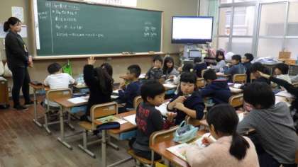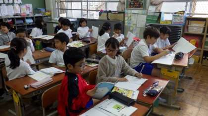3年生は算数で,重さの学習をしています。4年生は算数で,小数の計算の仕方について自分の考えをお互いに説明しています。5年生は図画工作で,木版画のすすめ方についての説明をきいています。