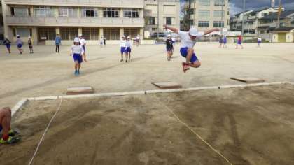 5年1組は,運動場でなわとびや走り幅跳びの学習をしています。2組は,体育館でマット運動の学習をしています。