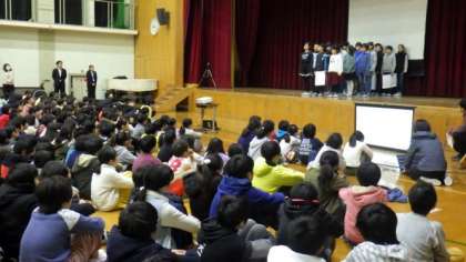 朝会では,放送委員会が発表をしました。毎日の給食放送の担当者や放送内容を紹介しました。なぞなぞやクイズも交えながら,楽しい発表をしました。