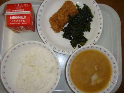 今日の献立は,「ごはん・牛乳・鰆のたつたあげ・ほうれん草のおかか煮・豚汁」でした。6年生がランチルームでした。