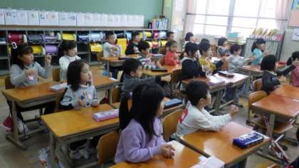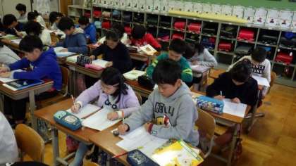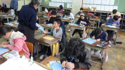 5年生は図画工作で木版画に取り組んでいます。スクールサポーターの先生に教えてもらいながら,彫刻刀で彫り進めています。4年生は算数で,表に整理する学習をしています。1年生は音楽で,英語を使った歌を手の動きも入れながら楽しく歌っています。