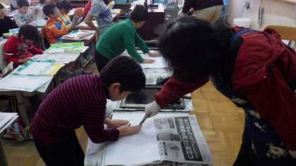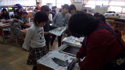 紙でつくった版に黒いインクをつけて,刷っています。刷り上がった版画をみて,うれしそうにしていました。
