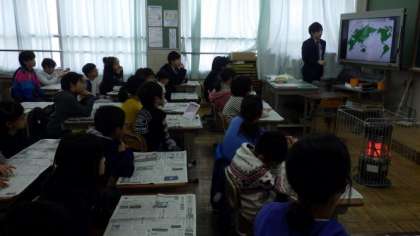 企業の方に来ていただき,「モーターと環境〜わたしたちができること〜」というテーマで出前授業をしていただきました。子どもたちはお話を聞いたり,モーターを使った活動したりして,環境について楽しく学習しました。