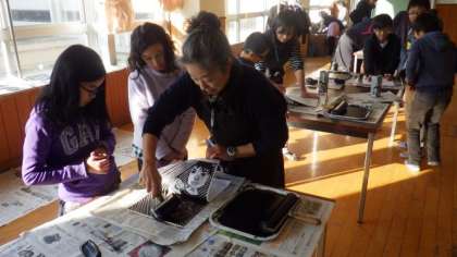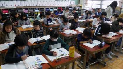 3年生は学習園で育てた九条ねぎの収穫をしています。5年生は図画工作で,木版画を刷っています。4年生は国語で,説明文の学習をしています。
