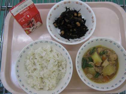 今日の献立は,「麦ごはん・牛乳・鶏肉と野菜の煮つけ・ひじき豆」でした。