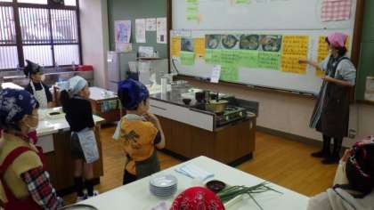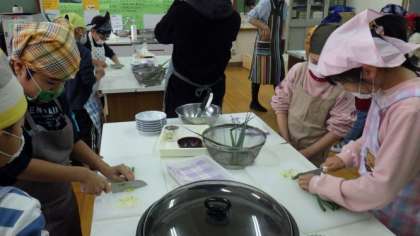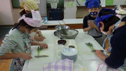 1・2時間目に3年2組が,自分たちで育てた九条ねぎを使って,ねぎやきの調理実習を行いました。包丁を使って,小口切りに挑戦していました。