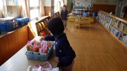 寒い季節ですが,大なわとびの練習をしているクラスがたくさんありました。絵本コーナーでは図書委員会がつくったしおりをもらっていました。