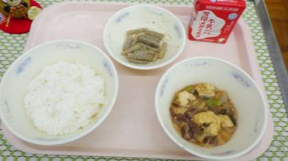 「いつも給食をつくってくださってありがとうございます。今日の給食では,すきやきふうにがごはんと合っておいしかったです。たたきごぼうは,よく味がしみていておいしかったです。」(6年児童)