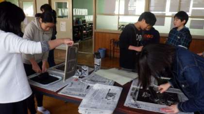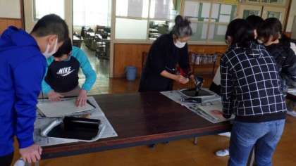 今日は,6年1組が木版を刷っています。
