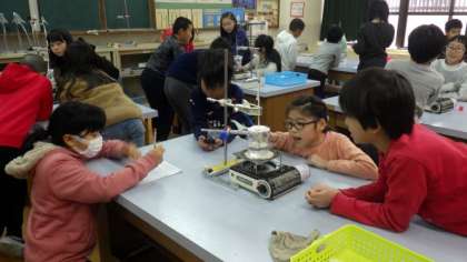 理科室で実験しています。水を熱したときの温度や様子を調べています。
