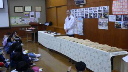 地域の有職料理で有名な萬亀楼さんから,お店の歴史や京料理について教えていただきました。始めに,式包丁の様子やお料理をされている様子,部屋やお庭のしつらえの様子などをDVDで見せていただきました。その後,昭和天皇が昭和3年に召し上がられたときの献立の巻物の実物や,お店で扱っている季節の器,料理によって使い分ける包丁など実物を見せていただきました。