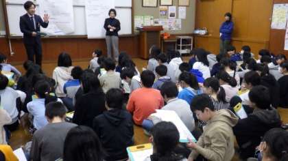 二条中学校の先生に来ていただき,英語の授業をしていただきました。友達や先生と今日食べた朝食についてインタビューする活動などをしました。