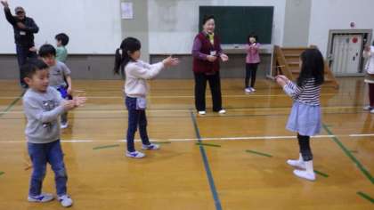 地域の方を講師にお招きし,昔遊びを教えていただきました。子どもたちは4グループに分かれ,竹とんぼ・めんこ・はねつき・こま・けん玉・お手玉(おじゃみ)・あやとり・おはじきの8つを体験しました。