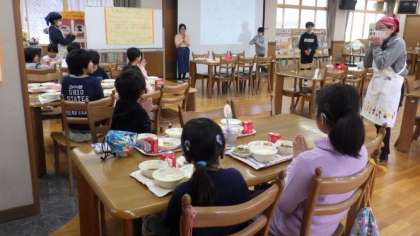 今日,草の芽学級の子ども達が今年度最終のランチルーム給食を行いました。6年生が給食紹介と「いただきます。」のあいさつをした後,各テーブルで楽しく会話しながら給食を食べました。