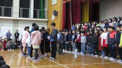 最後に,1年間活動してきたたて割りのにじょっこグループで作ったプレゼンを,6年生に渡しました。退場は花道をつくって見送りました。