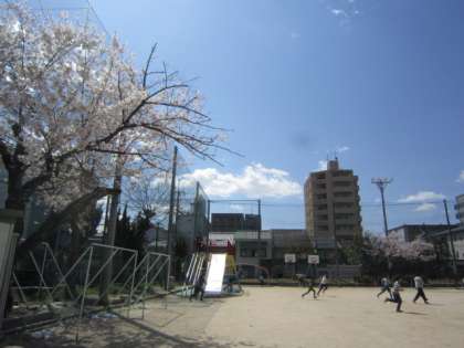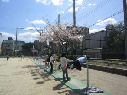 桜満開で運動場でとても気持ちよく遊んでいます。