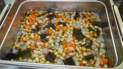 五目煮豆は,スチームコンベクションオーブンを使って作りました。味がしみこみ昆布もやわらかく仕上がりました。味つけはあっさりしていて,食べやすいと好評でした。