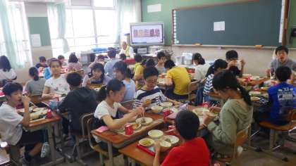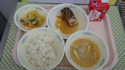 1年生の教室では,魚の食べ方のスライドを見ながら上手に鯖の骨をとりながら食べていました。6年生の教室では,味噌つくりでお世話になった地域のお味噌屋さんと一緒に給食を楽しんで食べていました。